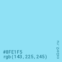 Цвет #8FE1F5 в цветовой модели RGB обозначается тремя октетами (143, 225, 245) в десятичном формате и #8FE1F5 в шестнадцатиричном (hex) формате, которые являются интенсивностью красного 143 (hex 8F), интенсивность зелёного 225 (hex E1) и интенсивность синего 245 (hex F5).