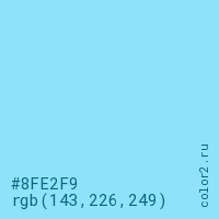 Цвет #8FE2F9 в цветовой модели RGB обозначается тремя октетами (143, 226, 249) в десятичном формате и #8FE2F9 в шестнадцатиричном (hex) формате, которые являются интенсивностью красного 143 (hex 8F), интенсивность зелёного 226 (hex E2) и интенсивность синего 249 (hex F9).
