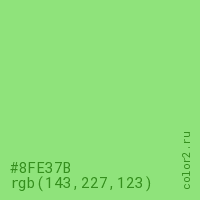 Цвет #8FE37B в цветовой модели RGB обозначается тремя октетами (143, 227, 123) в десятичном формате и #8FE37B в шестнадцатиричном (hex) формате, которые являются интенсивностью красного 143 (hex 8F), интенсивность зелёного 227 (hex E3) и интенсивность синего 123 (hex 7B).