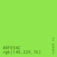 Цвет #8FE54C в цветовой модели RGB обозначается тремя октетами (143, 229, 76) в десятичном формате и #8FE54C в шестнадцатиричном (hex) формате, которые являются интенсивностью красного 143 (hex 8F), интенсивность зелёного 229 (hex E5) и интенсивность синего 76 (hex 4C).