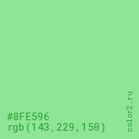 Цвет #8FE596 в цветовой модели RGB обозначается тремя октетами (143, 229, 150) в десятичном формате и #8FE596 в шестнадцатиричном (hex) формате, которые являются интенсивностью красного 143 (hex 8F), интенсивность зелёного 229 (hex E5) и интенсивность синего 150 (hex 96).