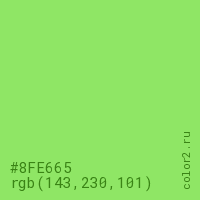 Цвет #8FE665 в цветовой модели RGB обозначается тремя октетами (143, 230, 101) в десятичном формате и #8FE665 в шестнадцатиричном (hex) формате, которые являются интенсивностью красного 143 (hex 8F), интенсивность зелёного 230 (hex E6) и интенсивность синего 101 (hex 65).