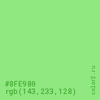 Цвет #8FE980 в цветовой модели RGB обозначается тремя октетами (143, 233, 128) в десятичном формате и #8FE980 в шестнадцатиричном (hex) формате, которые являются интенсивностью красного 143 (hex 8F), интенсивность зелёного 233 (hex E9) и интенсивность синего 128 (hex 80).