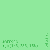 Цвет #8FE99C в цветовой модели RGB обозначается тремя октетами (143, 233, 156) в десятичном формате и #8FE99C в шестнадцатиричном (hex) формате, которые являются интенсивностью красного 143 (hex 8F), интенсивность зелёного 233 (hex E9) и интенсивность синего 156 (hex 9C).