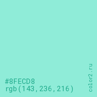 Цвет #8FECD8 в цветовой модели RGB обозначается тремя октетами (143, 236, 216) в десятичном формате и #8FECD8 в шестнадцатиричном (hex) формате, которые являются интенсивностью красного 143 (hex 8F), интенсивность зелёного 236 (hex EC) и интенсивность синего 216 (hex D8).