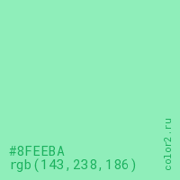 Цвет #8FEEBA в цветовой модели RGB обозначается тремя октетами (143, 238, 186) в десятичном формате и #8FEEBA в шестнадцатиричном (hex) формате, которые являются интенсивностью красного 143 (hex 8F), интенсивность зелёного 238 (hex EE) и интенсивность синего 186 (hex BA).