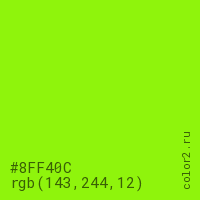 Цвет #8FF40C в цветовой модели RGB обозначается тремя октетами (143, 244, 12) в десятичном формате и #8FF40C в шестнадцатиричном (hex) формате, которые являются интенсивностью красного 143 (hex 8F), интенсивность зелёного 244 (hex F4) и интенсивность синего 12 (hex 0C).