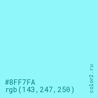 Цвет #8FF7FA в цветовой модели RGB обозначается тремя октетами (143, 247, 250) в десятичном формате и #8FF7FA в шестнадцатиричном (hex) формате, которые являются интенсивностью красного 143 (hex 8F), интенсивность зелёного 247 (hex F7) и интенсивность синего 250 (hex FA).