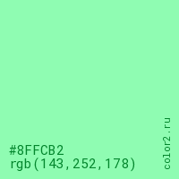 Цвет #8FFCB2 в цветовой модели RGB обозначается тремя октетами (143, 252, 178) в десятичном формате и #8FFCB2 в шестнадцатиричном (hex) формате, которые являются интенсивностью красного 143 (hex 8F), интенсивность зелёного 252 (hex FC) и интенсивность синего 178 (hex B2).