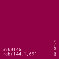 Цвет #900145 в цветовой модели RGB обозначается тремя октетами (144, 1, 69) в десятичном формате и #900145 в шестнадцатиричном (hex) формате, которые являются интенсивностью красного 144 (hex 90), интенсивность зелёного 1 (hex 01) и интенсивность синего 69 (hex 45).