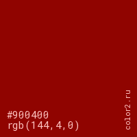 Цвет #900400 в цветовой модели RGB обозначается тремя октетами (144, 4, 0) в десятичном формате и #900400 в шестнадцатиричном (hex) формате, которые являются интенсивностью красного 144 (hex 90), интенсивность зелёного 4 (hex 04) и интенсивность синего 0 (hex 00).