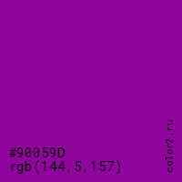 Цвет #90059D в цветовой модели RGB обозначается тремя октетами (144, 5, 157) в десятичном формате и #90059D в шестнадцатиричном (hex) формате, которые являются интенсивностью красного 144 (hex 90), интенсивность зелёного 5 (hex 05) и интенсивность синего 157 (hex 9D).