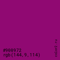 Цвет #900972 в цветовой модели RGB обозначается тремя октетами (144, 9, 114) в десятичном формате и #900972 в шестнадцатиричном (hex) формате, которые являются интенсивностью красного 144 (hex 90), интенсивность зелёного 9 (hex 09) и интенсивность синего 114 (hex 72).