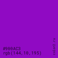 Цвет #900AC3 в цветовой модели RGB обозначается тремя октетами (144, 10, 195) в десятичном формате и #900AC3 в шестнадцатиричном (hex) формате, которые являются интенсивностью красного 144 (hex 90), интенсивность зелёного 10 (hex 0A) и интенсивность синего 195 (hex C3).