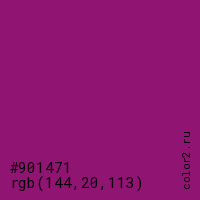 Цвет #901471 в цветовой модели RGB обозначается тремя октетами (144, 20, 113) в десятичном формате и #901471 в шестнадцатиричном (hex) формате, которые являются интенсивностью красного 144 (hex 90), интенсивность зелёного 20 (hex 14) и интенсивность синего 113 (hex 71).