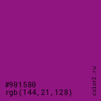 Цвет #901580 в цветовой модели RGB обозначается тремя октетами (144, 21, 128) в десятичном формате и #901580 в шестнадцатиричном (hex) формате, которые являются интенсивностью красного 144 (hex 90), интенсивность зелёного 21 (hex 15) и интенсивность синего 128 (hex 80).