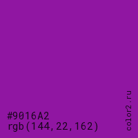 Цвет #9016A2 в цветовой модели RGB обозначается тремя октетами (144, 22, 162) в десятичном формате и #9016A2 в шестнадцатиричном (hex) формате, которые являются интенсивностью красного 144 (hex 90), интенсивность зелёного 22 (hex 16) и интенсивность синего 162 (hex A2).
