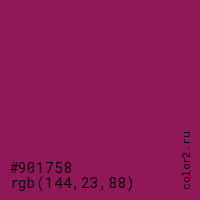 Цвет #901758 в цветовой модели RGB обозначается тремя октетами (144, 23, 88) в десятичном формате и #901758 в шестнадцатиричном (hex) формате, которые являются интенсивностью красного 144 (hex 90), интенсивность зелёного 23 (hex 17) и интенсивность синего 88 (hex 58).