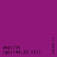 Цвет #901779 в цветовой модели RGB обозначается тремя октетами (144, 23, 121) в десятичном формате и #901779 в шестнадцатиричном (hex) формате, которые являются интенсивностью красного 144 (hex 90), интенсивность зелёного 23 (hex 17) и интенсивность синего 121 (hex 79).