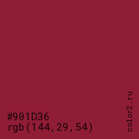 Цвет #901D36 в цветовой модели RGB обозначается тремя октетами (144, 29, 54) в десятичном формате и #901D36 в шестнадцатиричном (hex) формате, которые являются интенсивностью красного 144 (hex 90), интенсивность зелёного 29 (hex 1D) и интенсивность синего 54 (hex 36).