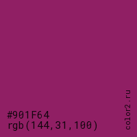 Цвет #901F64 в цветовой модели RGB обозначается тремя октетами (144, 31, 100) в десятичном формате и #901F64 в шестнадцатиричном (hex) формате, которые являются интенсивностью красного 144 (hex 90), интенсивность зелёного 31 (hex 1F) и интенсивность синего 100 (hex 64).