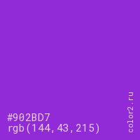 Цвет #902BD7 в цветовой модели RGB обозначается тремя октетами (144, 43, 215) в десятичном формате и #902BD7 в шестнадцатиричном (hex) формате, которые являются интенсивностью красного 144 (hex 90), интенсивность зелёного 43 (hex 2B) и интенсивность синего 215 (hex D7).