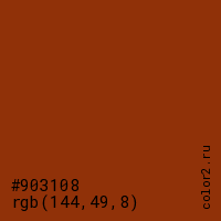 Цвет #903108 в цветовой модели RGB обозначается тремя октетами (144, 49, 8) в десятичном формате и #903108 в шестнадцатиричном (hex) формате, которые являются интенсивностью красного 144 (hex 90), интенсивность зелёного 49 (hex 31) и интенсивность синего 8 (hex 08).