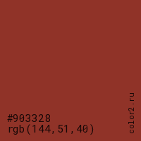 Цвет #903328 в цветовой модели RGB обозначается тремя октетами (144, 51, 40) в десятичном формате и #903328 в шестнадцатиричном (hex) формате, которые являются интенсивностью красного 144 (hex 90), интенсивность зелёного 51 (hex 33) и интенсивность синего 40 (hex 28).