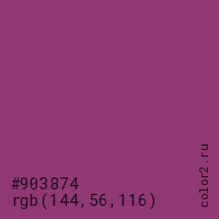 Цвет #903874 в цветовой модели RGB обозначается тремя октетами (144, 56, 116) в десятичном формате и #903874 в шестнадцатиричном (hex) формате, которые являются интенсивностью красного 144 (hex 90), интенсивность зелёного 56 (hex 38) и интенсивность синего 116 (hex 74).
