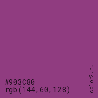 Цвет #903C80 в цветовой модели RGB обозначается тремя октетами (144, 60, 128) в десятичном формате и #903C80 в шестнадцатиричном (hex) формате, которые являются интенсивностью красного 144 (hex 90), интенсивность зелёного 60 (hex 3C) и интенсивность синего 128 (hex 80).