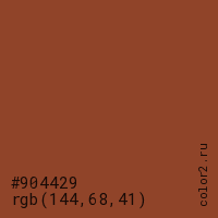 Цвет #904429 в цветовой модели RGB обозначается тремя октетами (144, 68, 41) в десятичном формате и #904429 в шестнадцатиричном (hex) формате, которые являются интенсивностью красного 144 (hex 90), интенсивность зелёного 68 (hex 44) и интенсивность синего 41 (hex 29).