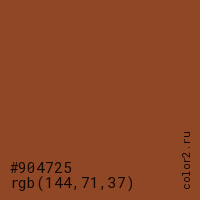Цвет #904725 в цветовой модели RGB обозначается тремя октетами (144, 71, 37) в десятичном формате и #904725 в шестнадцатиричном (hex) формате, которые являются интенсивностью красного 144 (hex 90), интенсивность зелёного 71 (hex 47) и интенсивность синего 37 (hex 25).