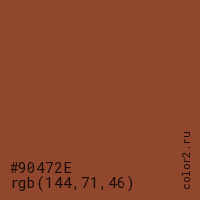 Цвет #90472E в цветовой модели RGB обозначается тремя октетами (144, 71, 46) в десятичном формате и #90472E в шестнадцатиричном (hex) формате, которые являются интенсивностью красного 144 (hex 90), интенсивность зелёного 71 (hex 47) и интенсивность синего 46 (hex 2E).