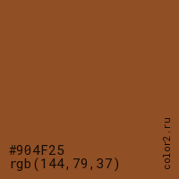 Цвет #904F25 в цветовой модели RGB обозначается тремя октетами (144, 79, 37) в десятичном формате и #904F25 в шестнадцатиричном (hex) формате, которые являются интенсивностью красного 144 (hex 90), интенсивность зелёного 79 (hex 4F) и интенсивность синего 37 (hex 25).