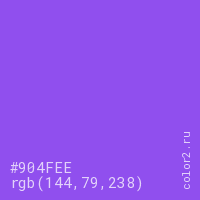 Цвет #904FEE в цветовой модели RGB обозначается тремя октетами (144, 79, 238) в десятичном формате и #904FEE в шестнадцатиричном (hex) формате, которые являются интенсивностью красного 144 (hex 90), интенсивность зелёного 79 (hex 4F) и интенсивность синего 238 (hex EE).