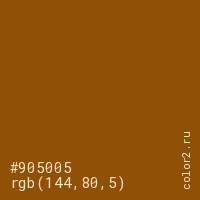 Цвет #905005 в цветовой модели RGB обозначается тремя октетами (144, 80, 5) в десятичном формате и #905005 в шестнадцатиричном (hex) формате, которые являются интенсивностью красного 144 (hex 90), интенсивность зелёного 80 (hex 50) и интенсивность синего 5 (hex 05).