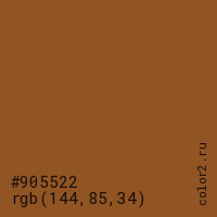 Цвет #905522 в цветовой модели RGB обозначается тремя октетами (144, 85, 34) в десятичном формате и #905522 в шестнадцатиричном (hex) формате, которые являются интенсивностью красного 144 (hex 90), интенсивность зелёного 85 (hex 55) и интенсивность синего 34 (hex 22).
