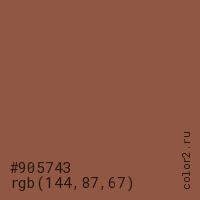Цвет #905743 в цветовой модели RGB обозначается тремя октетами (144, 87, 67) в десятичном формате и #905743 в шестнадцатиричном (hex) формате, которые являются интенсивностью красного 144 (hex 90), интенсивность зелёного 87 (hex 57) и интенсивность синего 67 (hex 43).