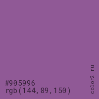 Цвет #905996 в цветовой модели RGB обозначается тремя октетами (144, 89, 150) в десятичном формате и #905996 в шестнадцатиричном (hex) формате, которые являются интенсивностью красного 144 (hex 90), интенсивность зелёного 89 (hex 59) и интенсивность синего 150 (hex 96).