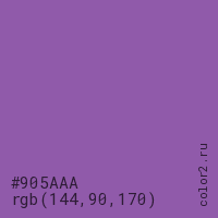 Цвет #905AAA в цветовой модели RGB обозначается тремя октетами (144, 90, 170) в десятичном формате и #905AAA в шестнадцатиричном (hex) формате, которые являются интенсивностью красного 144 (hex 90), интенсивность зелёного 90 (hex 5A) и интенсивность синего 170 (hex AA).