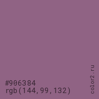 Цвет #906384 в цветовой модели RGB обозначается тремя октетами (144, 99, 132) в десятичном формате и #906384 в шестнадцатиричном (hex) формате, которые являются интенсивностью красного 144 (hex 90), интенсивность зелёного 99 (hex 63) и интенсивность синего 132 (hex 84).