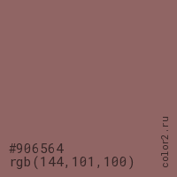 Цвет #906564 в цветовой модели RGB обозначается тремя октетами (144, 101, 100) в десятичном формате и #906564 в шестнадцатиричном (hex) формате, которые являются интенсивностью красного 144 (hex 90), интенсивность зелёного 101 (hex 65) и интенсивность синего 100 (hex 64).