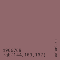 Цвет #90676B в цветовой модели RGB обозначается тремя октетами (144, 103, 107) в десятичном формате и #90676B в шестнадцатиричном (hex) формате, которые являются интенсивностью красного 144 (hex 90), интенсивность зелёного 103 (hex 67) и интенсивность синего 107 (hex 6B).