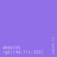 Цвет #906FE9 в цветовой модели RGB обозначается тремя октетами (144, 111, 233) в десятичном формате и #906FE9 в шестнадцатиричном (hex) формате, которые являются интенсивностью красного 144 (hex 90), интенсивность зелёного 111 (hex 6F) и интенсивность синего 233 (hex E9).