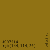 Цвет #907214 в цветовой модели RGB обозначается тремя октетами (144, 114, 20) в десятичном формате и #907214 в шестнадцатиричном (hex) формате, которые являются интенсивностью красного 144 (hex 90), интенсивность зелёного 114 (hex 72) и интенсивность синего 20 (hex 14).