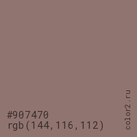 Цвет #907470 в цветовой модели RGB обозначается тремя октетами (144, 116, 112) в десятичном формате и #907470 в шестнадцатиричном (hex) формате, которые являются интенсивностью красного 144 (hex 90), интенсивность зелёного 116 (hex 74) и интенсивность синего 112 (hex 70).