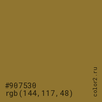 Цвет #907530 в цветовой модели RGB обозначается тремя октетами (144, 117, 48) в десятичном формате и #907530 в шестнадцатиричном (hex) формате, которые являются интенсивностью красного 144 (hex 90), интенсивность зелёного 117 (hex 75) и интенсивность синего 48 (hex 30).