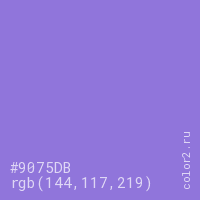 Цвет #9075DB в цветовой модели RGB обозначается тремя октетами (144, 117, 219) в десятичном формате и #9075DB в шестнадцатиричном (hex) формате, которые являются интенсивностью красного 144 (hex 90), интенсивность зелёного 117 (hex 75) и интенсивность синего 219 (hex DB).