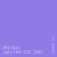 Цвет #907AE6 в цветовой модели RGB обозначается тремя октетами (144, 122, 230) в десятичном формате и #907AE6 в шестнадцатиричном (hex) формате, которые являются интенсивностью красного 144 (hex 90), интенсивность зелёного 122 (hex 7A) и интенсивность синего 230 (hex E6).