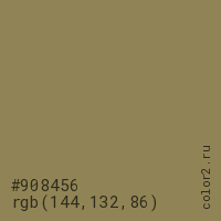 Цвет #908456 в цветовой модели RGB обозначается тремя октетами (144, 132, 86) в десятичном формате и #908456 в шестнадцатиричном (hex) формате, которые являются интенсивностью красного 144 (hex 90), интенсивность зелёного 132 (hex 84) и интенсивность синего 86 (hex 56).